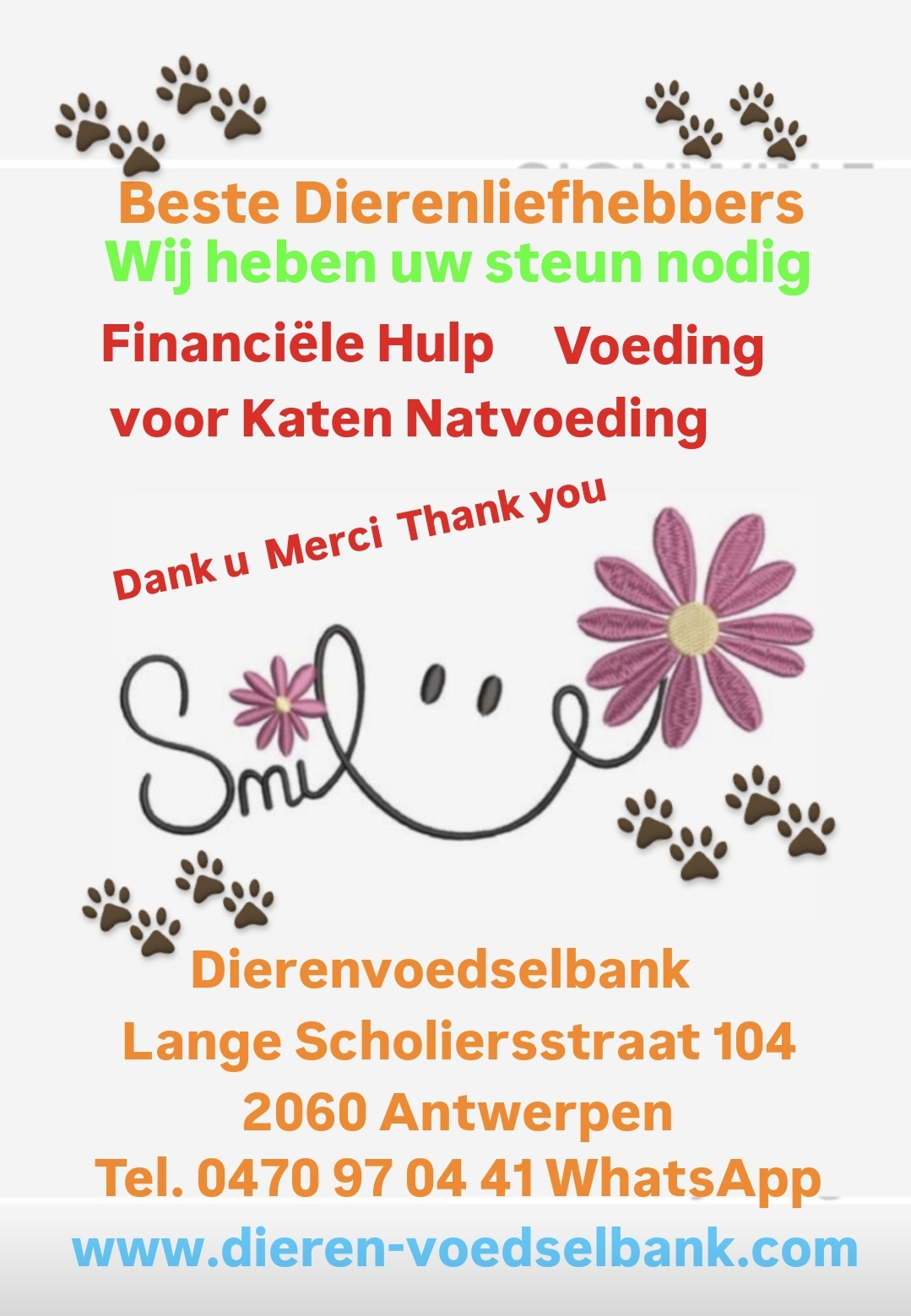 We willen een inzamelactie opzetten voor kattenvoer en honden en knaagdieren voer en vlees en benodigdheden wat ze allemaal nodig zijn wil u wat brengen of financiële ondersteuning willen doen elke maand kleine bijdrage altijd welkom of eenmalig wat u wil of blikken of flessen voor onze dieren wat we doen we helpen mensen die in minima hulp zitten en hun dieren wel willen behouden en toch nog eten krijgen dan van ons als ondersteuning punt voor de gezinnen elke maand kunnen ze dan pakket ophalen daarom hebben we ook aardig wat voer en vlees en benodigdheden nodig wat u kan doen is u mag brengen we zitten in de Lange Scholiersstraat 104
